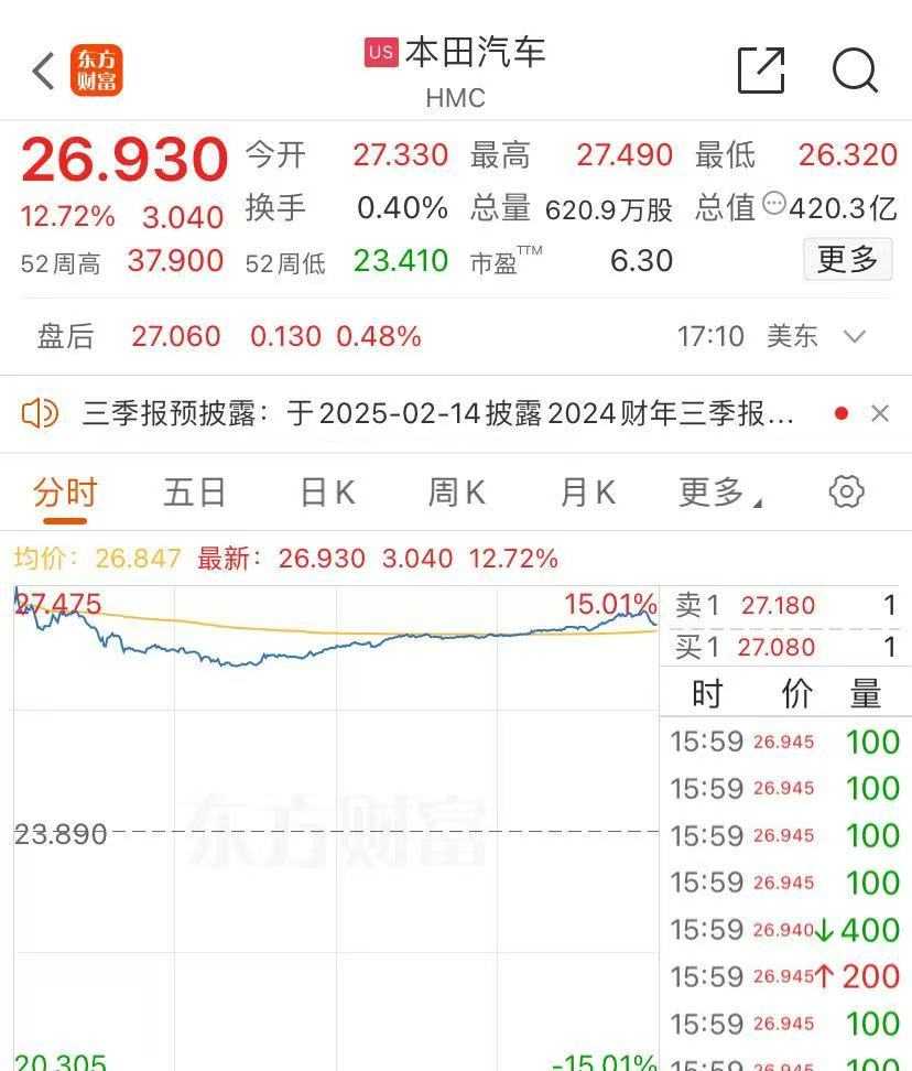 本田汽车成为市场焦点,截至美股收盘,其股价暴涨12.72%,总市值达到420.34亿美元。这一暴涨背后,是日本汽车制造商本田与日产宣布将合并的消息。双方已签署谅解备忘录,计划共同出资成立一家控股公司,以实现更大规模的经济效益。