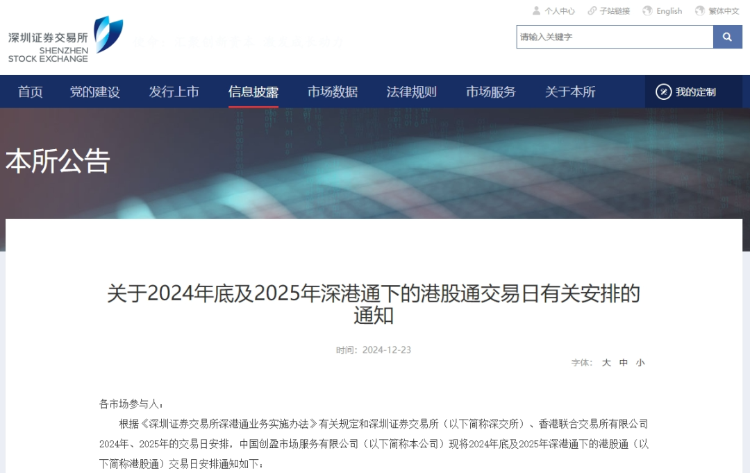 12月23日,上海证券交易所(上交所)与深圳证券交易所(深交所)联合公布了2025年部分节假日的休市安排。同时,沪深交易所的子公司也发布了关于2024年底及2025年沪深港通下港股通交易日的安排通知。