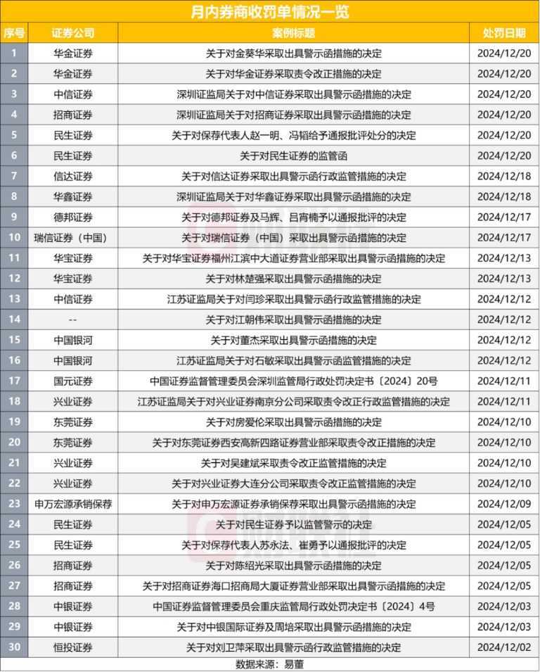 这6家券商在同一时间收到监管罚单,确实存在一定的巧合。首先,这些罚单来自不同的监管局;其次,在当前的严监管环境下,中介机构业务罚单较多已成为证券行业的共识,因此不必过度解读;再者,从近几年的情况来看,每年年底都会出现罚单的集中出台。