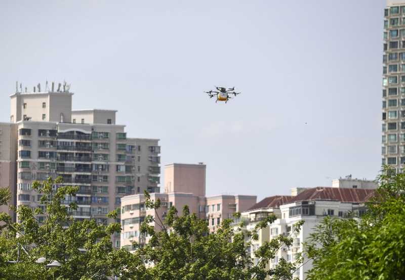 在深圳福田口岸,无人机搭载餐食在城市上空飞行,展示了交通运输的新业态。