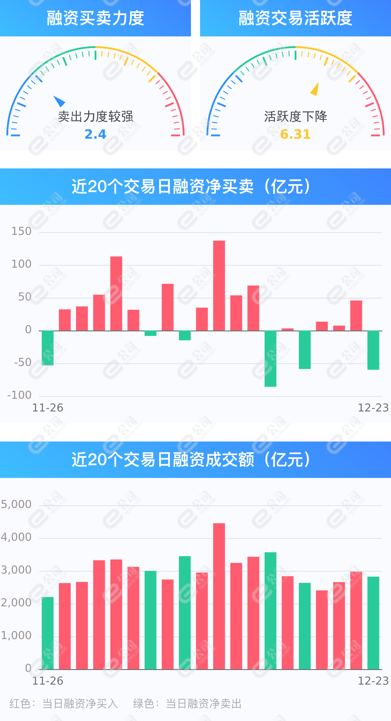 截至12月23日,沪深两所融资余额分别较前一日有所下滑,上交所减少35.55亿元,深交所减少24.36亿元,两市合计减少59.91亿元,融资客中止连续3日净买入。