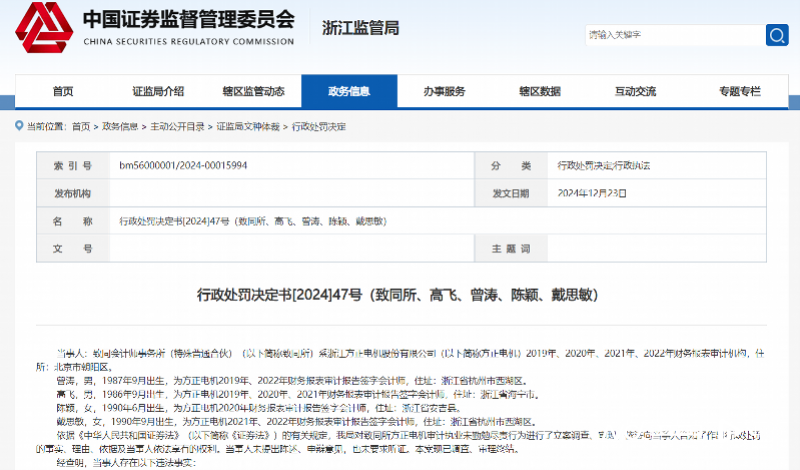 12月23日,证监会浙江监管局对致同所及4名签字注册会计师下发行政处罚决定书,因在方正电机多期年度财务报表审计过程中未勤勉尽责,责令致同所改正,没收业务收入150余万元,并处以同等金额罚款;对4名签字注册会计师给予警告,并分别处以20-30万元罚款。南都记者梳理发现,今年以来致同所在提供审计服务过程中多次“踩雷”财务造假的上市公司。