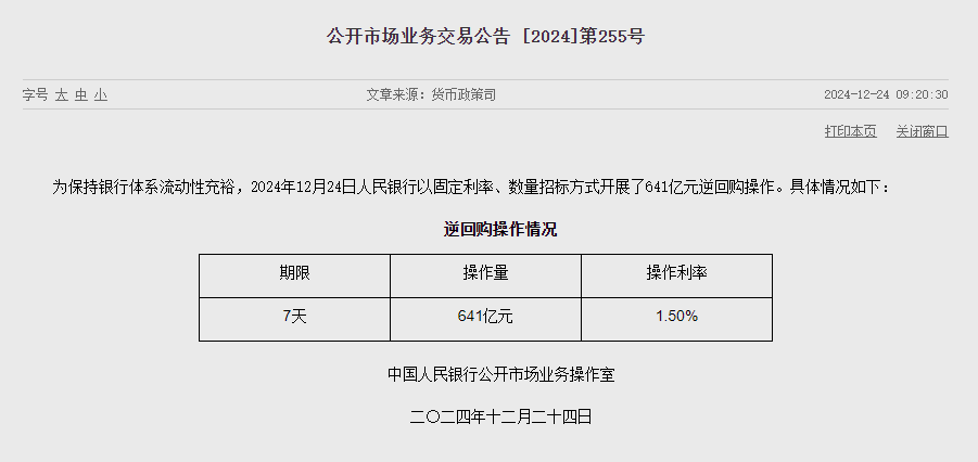 据央行官方网站最新消息,为确保银行体系流动性保持充裕状态,人民银行于12月24日采取了固定利率、数量招标的方式,成功进行了总额为641亿元的7天期逆回购操作。此次操作的中标利率维持在1.50%,与前期保持一致。然而,由于当日有3554亿元的7天期逆回购到期,因此实际实现了2913亿元的净回笼。