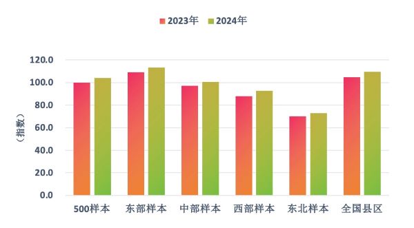 研究发现,全国样本县(市)综合发展指数增长迅速,显示县域发展态势良好;但与大中城市城区相比,县域综合发展水平仍有待提升。2024年,500样本县(市)综合发展指数平均值为104.1,增长4.1%。经济水平、发展动能和科技创新指数均超110.0,增长10.0%以上;绿色发展指数基本持平。分地区看,东部样本县(市)指数最高,中部、西部和东北依次递减,但均有所增长。