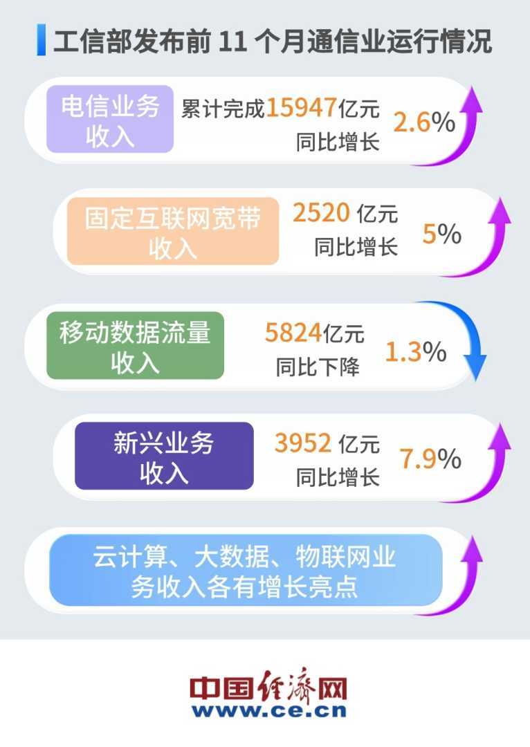 中国通信业前11个月整体运行平稳,电信业务收入同比增长2.6%,新兴业务收入同比增长7.9%,移动互联网接入流量较快增长,展现出强劲的发展势头。