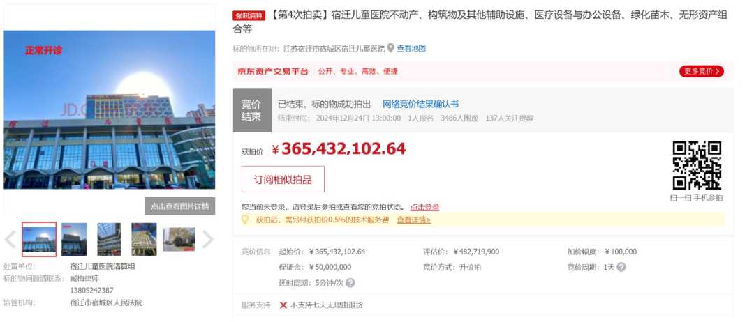 红星资本局12月24日报道,今日午间,宿迁儿童医院经过四次拍卖终于以起拍价3.65亿元成功成交。据京东资产交易平台数据显示,本次拍卖吸引了超过3000人围观,137人设置了关注提醒,并最终仅有1次出价记录。