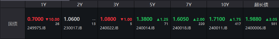 截至消息发布时,市场数据显示,7年期国债活跃券的收益率上涨了2个基点(bp);而10年期国债活跃券的收益率则更为显著地上扬了1.75bp,报于1.710%,成功收复1.7%的整数关口,显示出市场对长期债券需求的微妙变化。此外,30年期国债活跃券的收益率也紧随其后,上行了3.05bp,正逐步逼近2.0%的敏感关口,进一步加剧了市场的紧张氛围。