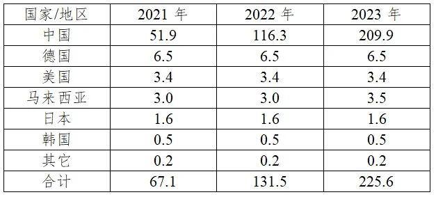 近十年来,全球多晶硅产能持续稳步攀升。2023年,全球多晶硅产能高达225.6万吨,同比增长71.6%,这一显著增长主要归因于下游光伏装机需求的迅猛扩张,促使众多企业纷纷扩大产能。中国作为多晶硅生产大国,其产能达209.9万吨,占全球总产能的93.1%,彰显出绝对的领先优势。海外产能则主要分布在德国、美国、马来西亚及日本等地。