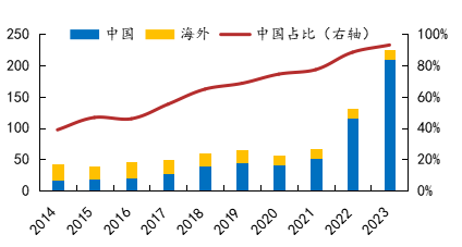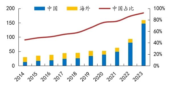近年来,在国家政策的扶持下,国内光伏行业蓬勃发展,带动多晶硅产能显著增长。2014至2023年间,多晶硅产能从16.5万吨增加至209.9万吨,年均复合增长率高达32.7%。自2020年起,多晶硅价格飙升,促使企业纷纷布局一体化产能项目,这些项目于2022年下半年陆续投产,推动2022年和2023年的产能分别同比增加124.1%和80.5%,远超年均复合增长率。