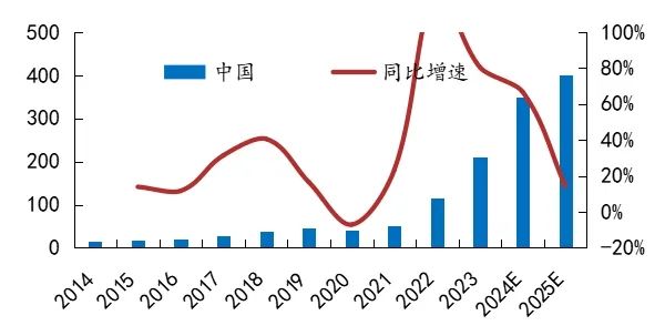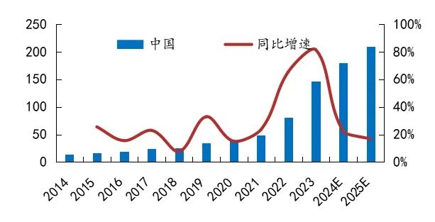 图表4:2014-2025年国内多晶硅产能及同比增速(万吨)
