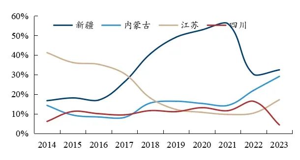 从地区分布来看,受电价影响,多晶硅产能逐步向新疆、内蒙古等能源优势地区集中。近年来,产能重心由江苏向新疆、内蒙古、四川等地转移。新疆多晶硅产能占比虽有所下降,但内蒙古、青海、甘肃等地的新增产能项目不断涌现,推动多晶硅产业持续发展。