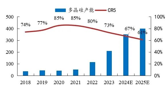 图表7:2018-2025年国内多晶硅产能以及CR5变化(万吨)