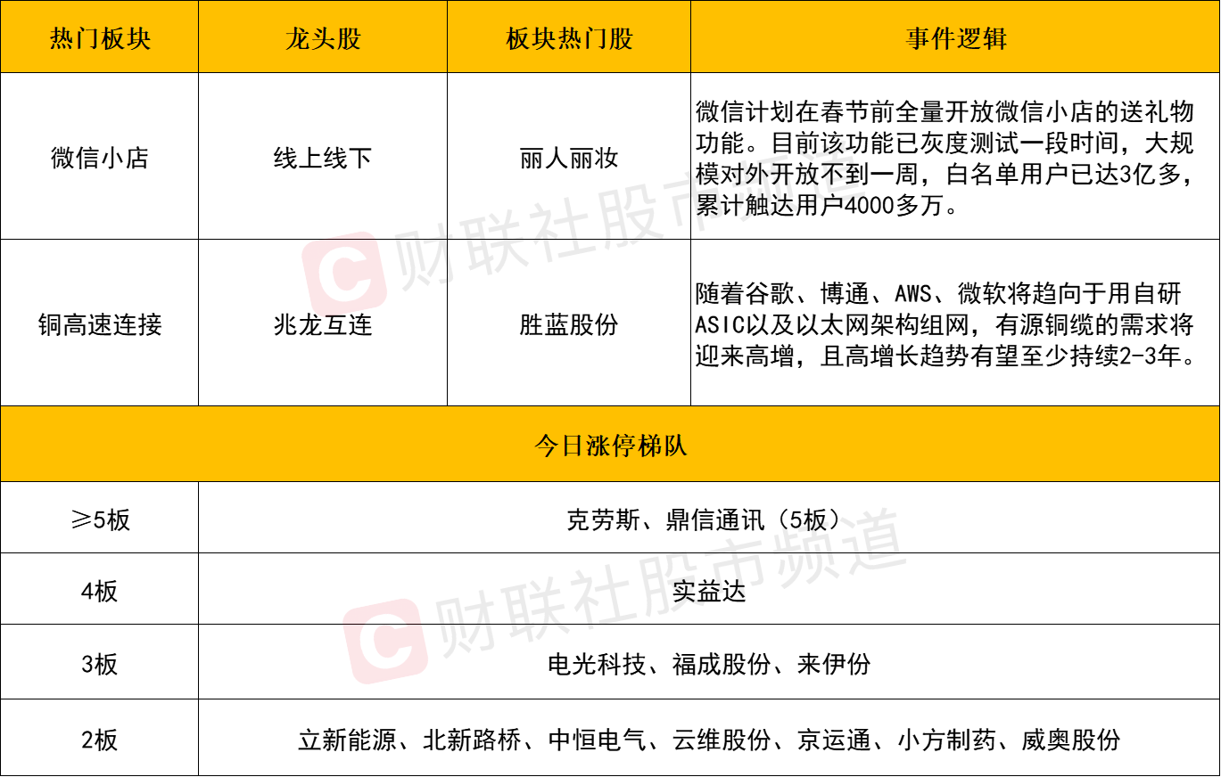 微信小店概念午后异动拉升,线上线下、海宁皮城等个股涨停。消息面上,微信计划在春节前全量开放微信小店的送礼物功能,该功能已灰度测试一段时间,白名单用户已达3亿多。机构研报认为,微信小店“送礼物”功能有望在送礼场景取得千亿级市场份额,社交电商总规模有望在2027年达到万亿。互联网电商个股或受益,契合年底节假日送礼需求的品类也值得关注。