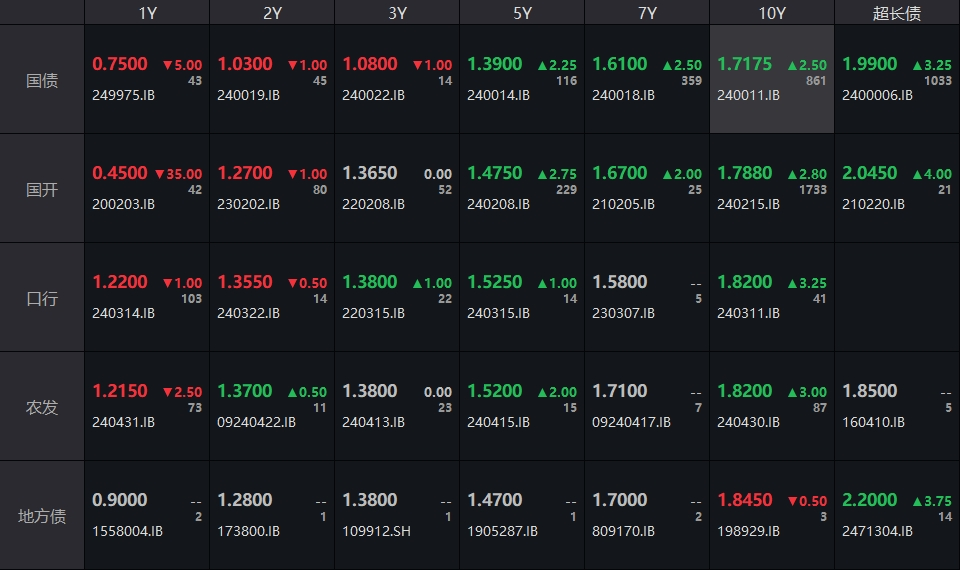 银行间主要利率债市场表现分化,长短期收益率走势不一。截至北京时间16:30,10年期国债活跃券收益率上行2.5bp至1.7175%,30年期国债活跃券收益率上行3.25bp至1.99%,而短端需求依然旺盛,与中长期品种形成鲜明对比。