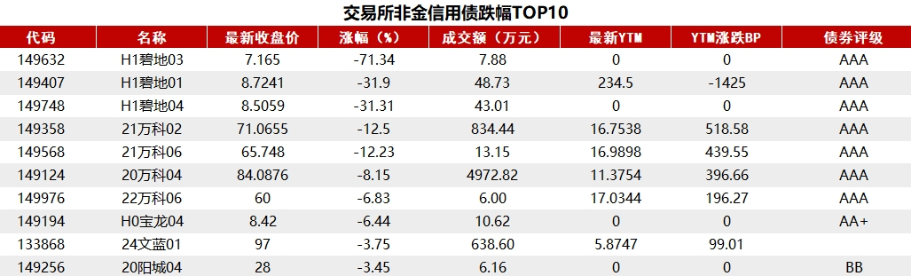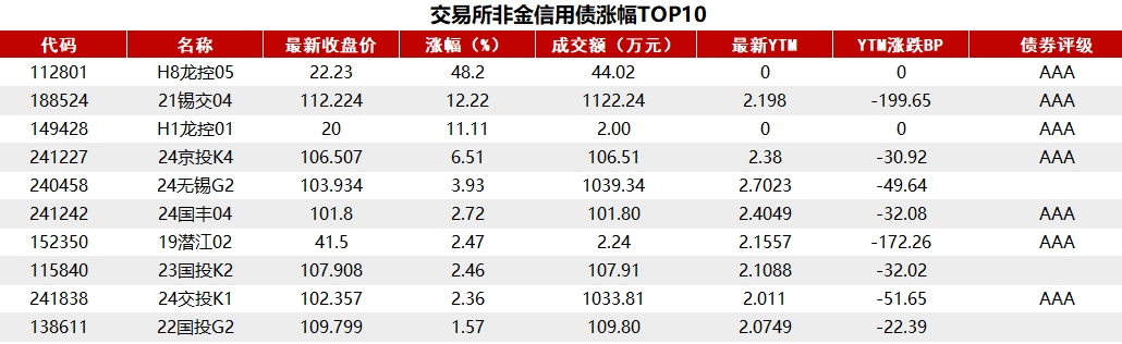 交易所信用债市场涨跌不一,非金信用债跌幅排行前五的债券中,碧桂园相关债券占据三席。而涨幅排行前五的债券则包括龙控、锡交等相关债券。