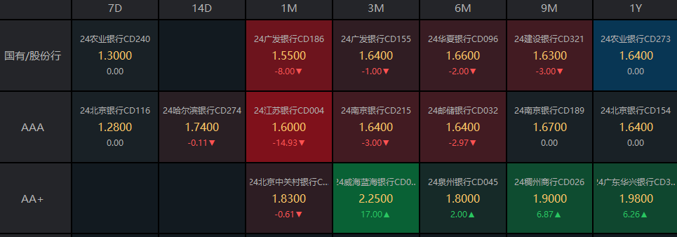 存单方面,今日国股存单需求较好,各期限品种利率均较前一日有所下行。AAA级存单方面,9个月和1年期品种成交利率也呈现下行态势。