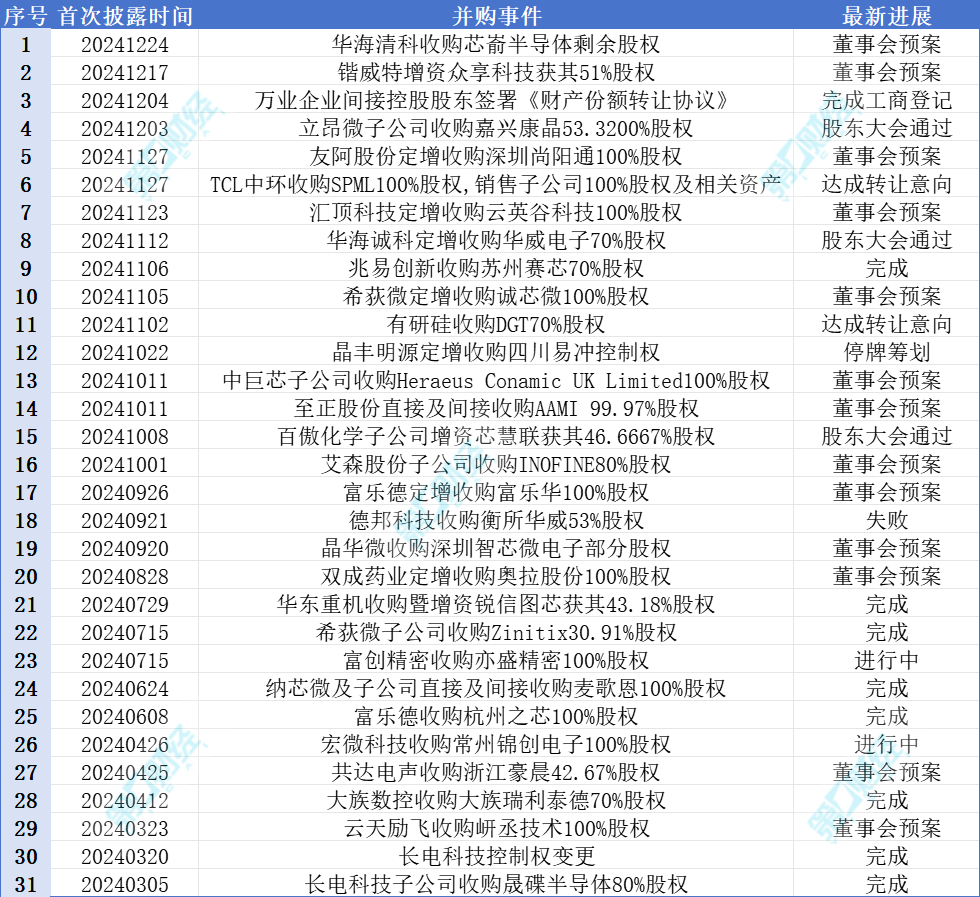 半导体材料方面,立昂微、TCL中环、有研硅等上游硅片厂商,以及中巨芯、艾森股份等半导体制造设备原材料供应商,还有提供半导体封装原材料的华威电子等,均发起了并购。