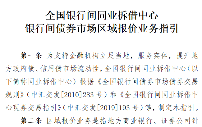 为强化金融服务地方经济的功能,提升债券市场流动性,全国银行间同业拆借中心于12月24日颁布了《全国银行间同业拆借中心银行间债券市场区域报价业务指引》(以下简称《指引》),该指引自发布之日起即刻施行。