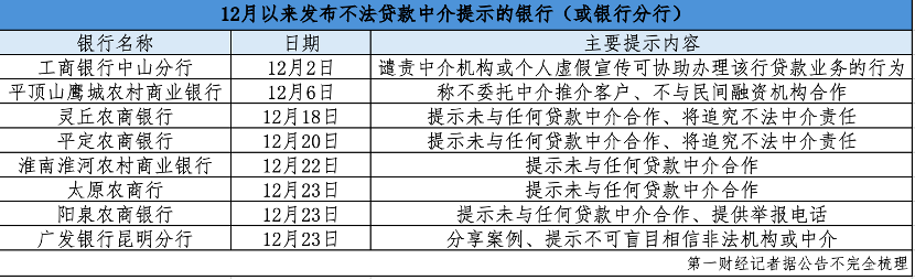 面对乱象,银行机构开始密集发声,主动“划清界限”。12月以来,已有包括广东、山西、安徽、云南、浙江等地的十余家银行针对贷款中介乱象密集发声。同时,监管也在密集提示消费者注意不法贷款中介存在的风险。