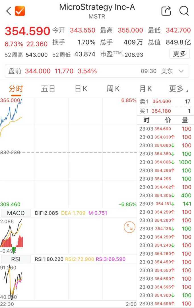 当日,MicroStrategy开盘后股价直线拉升,截至发稿时涨幅达6.73%,报354.590美元/股。这一事件不仅引起了市场广泛关注,也对相关指数基金产生了深远影响。