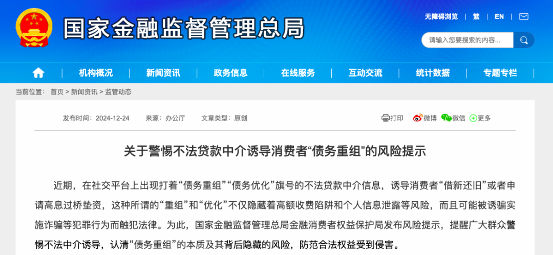 金融监管总局警示:警惕不法贷款中介诱导“债务重组”风险
