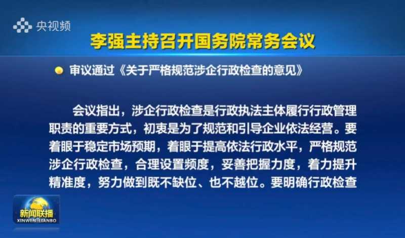 12月23日,国务院总理李强主持召开国务院常务会议,审议通过《关于严格规范涉企行政检查的意见》。(央视截图)
