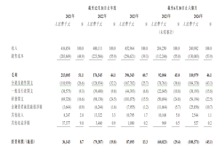在推广支出方面,卓越睿新的销售及分销开支在近年来持续增加。2022年,公司的销售及分销开支同比增加16.2%至1.29亿元,占收入的比重也大幅增加。而在2024年上半年,这一趋势仍在持续,销售及分销开支同比增加32.5%至1.04亿元。