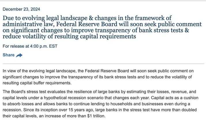就在起诉前一天,美联储发布公告称,计划对美国大型银行的年度压力测试进行重大调整,以提高透明度,降低测试结果波动性。