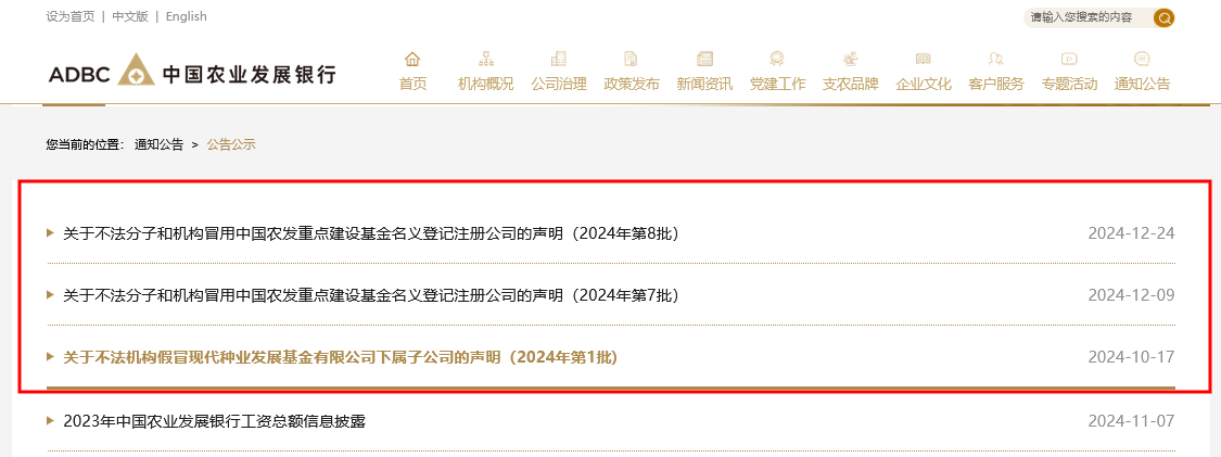 进一步加大打击假冒央企与挂靠国企的力度,已成为维护社会诚信体系不可或缺的一环。12月24日,中国农业发展银行(简称农发行)在官网发布声明,公开揭露中能富邦(重庆)农业科技有限公司伪造印章,假冒其下属子公司——中国农发重点建设基金有限公司名义进行市场活动。