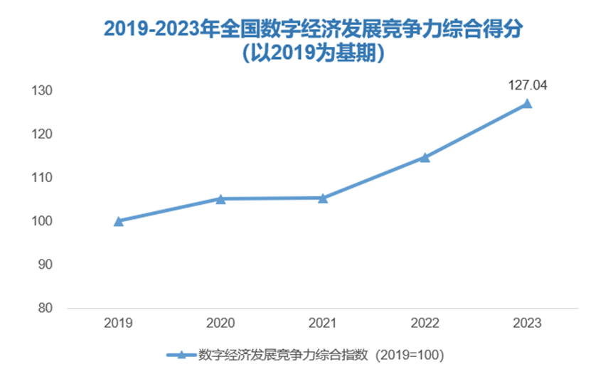 《报告》数据显示,自2018年以来,我国数字经济发展竞争力显著增强,呈现出快速增长的态势。截至2023年底,我国数字经济发展竞争力综合得分达到127分,较上一年度增长了10.7%。