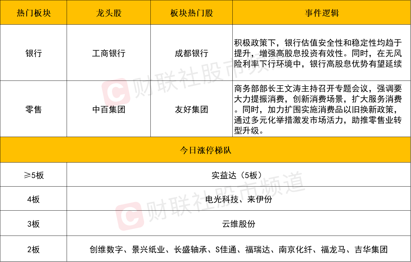 零售股出现局部回暖,中百集团、百大集团、东百集团、友好集团等多只个股涨停,上海九百、永辉超市等涨幅居前。近期,消费方向迎来了密集的政策催化,商务部强调要大力提振消费,创新消费场景,扩大服务消费,并加力扩围实施消费品以旧换新政策,助推零售业转型升级。微信小店概念股今日分化,但前排个股如实益达、来伊份依旧连板,或仍有望与大消费(零售)一同活跃。