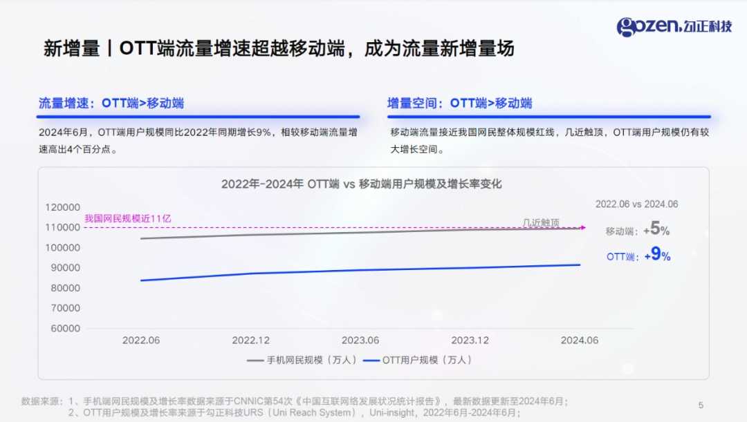 12月24日,勾正科技发布了《2024年智能大屏(OTT)媒体价值研究与营销趋势洞察》报告。报告揭示,过去三年内,智能大屏(OTT)的流量增速接近移动端的两倍,移动场景流量增长已接近饱和,“客厅经济”正逐步成为流量增长的新领域。