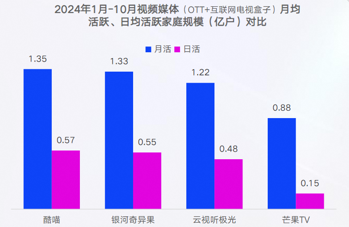 在OTT+电视盒子端,2024年前10个月,酷喵月活家庭用户高达1.35亿,日活家庭用户达0.57亿,均位居行业首位;银河奇异果则以1.33亿月活和0.55亿日活紧随其后,排名第二。