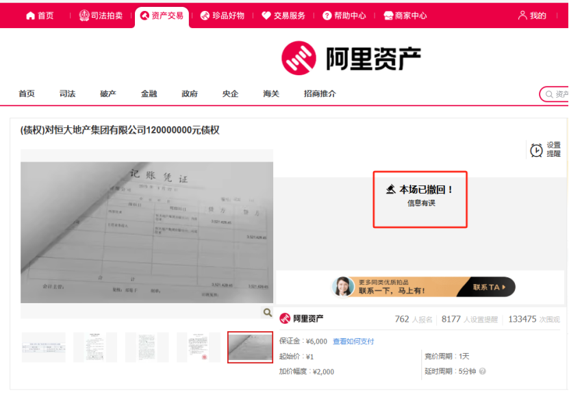 备受瞩目的恒大地产债权拍卖事件突生变故。12月25日下午,券商中国记者发现,原计划在阿里资产·司法拍卖平台上进行的多笔恒大地产债权项目拍卖被悉数撤回,公告中给出的理由是“信息有误”。