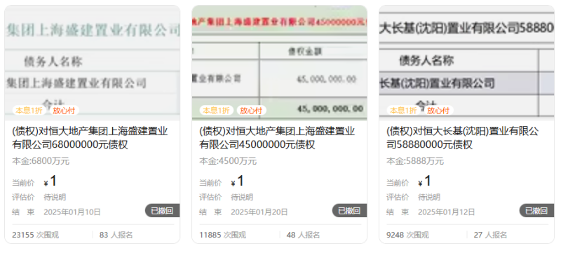 此次被撤回的拍卖项目涉及恒大地产集团有限公司的1.2亿元债权、恒大地产集团上海盛建置业有限公司的6800万元和4500万元债权、恒大长基(沈阳)置业有限公司的5888万元债权以及成都恒大御府首期二期的105.20万元工程款债权等。这些拍卖原计划在2025年1月进行,但均因“信息有误”而被撤回。