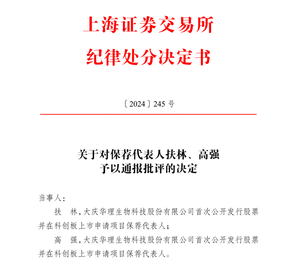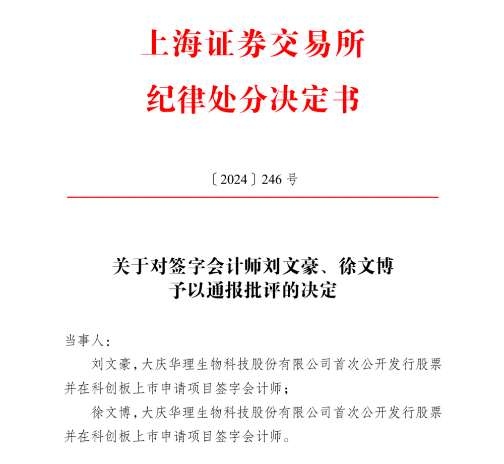 针对上述违规问题,上交所对华理生物及其时任董事长、总经理、财务总监等责任人予以通报批评,并记入证监会诚信档案数据库。同时,对民生证券及其保荐代表人扶林、高强也予以监管警示和通报批评。大华会计师事务所及其签字会计师刘文豪、徐文博也因未能充分履行核查职责而受到相应处罚。