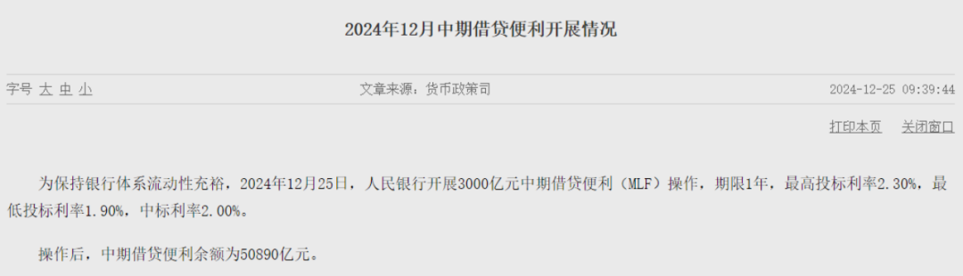 为维护银行体系流动性合理充裕,人民银行(央行)于12月25日实施了3000亿元的中期借贷便利(MLF)操作,期限为1年,中标利率定为2.00%,介于最高投标利率2.30%与最低投标利率1.90%之间。此次操作正值12月16日有1.45万亿元MLF到期,因此当月MLF净回笼1.15万亿元,操作后MLF余额为50890亿元。