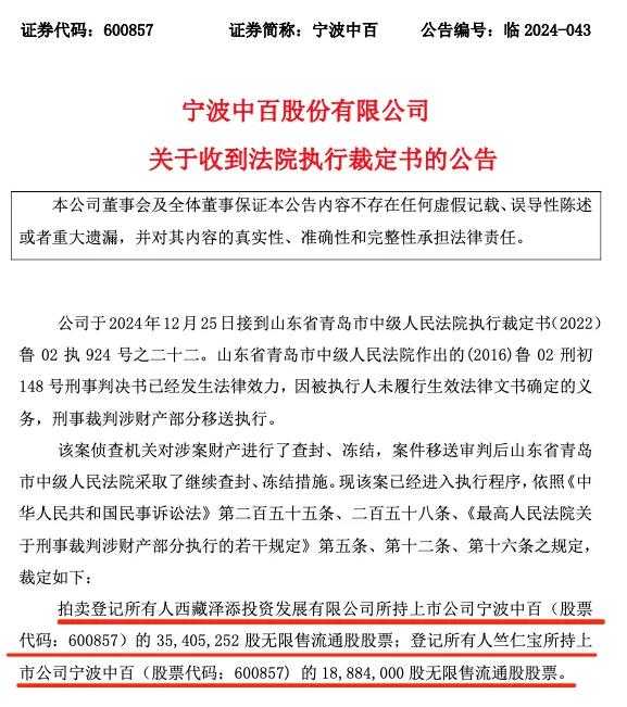 12月25日晚,宁波中百(600857)发布公告称,公司于当日接到青岛中院的执行裁定书,裁定拍卖登记所有人西藏泽添投资发展有限公司所持宁波中百的3540.53万股及竺仁宝所持的1888.4万股无限售流通股股票。同日晚间,大恒科技(600288)与华丽家族(600503)也相继发布了与徐翔案相关的资产拍卖公告。大恒科技公告显示,青岛中院裁定将拍卖登记郑素贞所持大恒科技的1.2996亿股无限售流通股股票,占公司总股本的29.75%。华丽家族则公告称,青岛中院将拍卖公司持股5%以上股东上海泽熙增煦投资中心所持有的9000万股股票,占公司总股本的5.62%。目前,上述三起司法拍卖的时间和形式尚未确定。