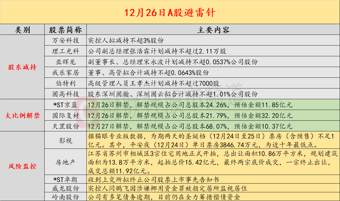 导读:财联社12月26日发布投资避雷针,近期A股及海外市场潜在风险概览如下。国内经济方面:1)圣诞档票房低迷,平安夜单日票房创下近十年新低;2)苏州三宗宅地出让,两宗底价成交,一宗流拍;3)广电总局对网络视听平台“红果短剧”提出规范要求。公司预警方面:多家上市公司高管计划减持股份,其中*ST卓朗面临退市风险。海外市场预警:戴比尔斯钻石库存激增,外国投资者撤离韩国股市,韩国实体经济受冲击。