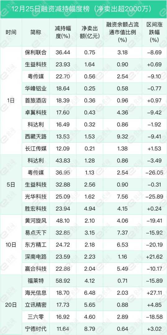 在单日净买卖超2000万元以上的个股中,通业科技、锐捷网络和显盈科技分别获得融资增持70.77%、36.65%和35.75%。而保利联合、生益科技和粤传媒则分别面临融资减持36.44%、23.93%和22.7%。