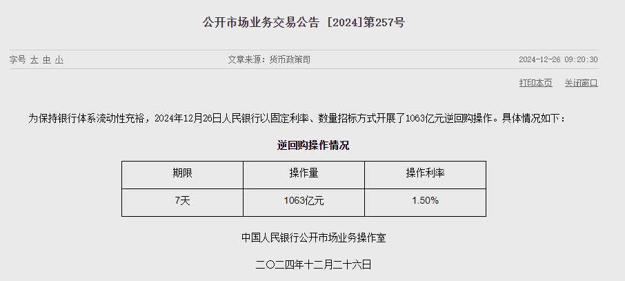 据央行官方网站发布消息,为了维持银行体系流动性的充裕状态,人民银行于12月26日通过固定利率和数量招标的方式,成功开展了总额为1063亿元的7天期逆回购操作。此次操作的中标利率维持在1.50%,与前期保持一致。考虑到当天有806亿元的7天期逆回购到期,人民银行实际上实现了257亿元的净投放。