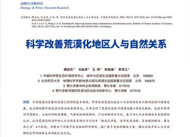 在最新出版的《中国科学院院刊》中,傅伯杰院士、刘焱序、王帅等学者联合发表文章,指出中国荒漠化扩张的趋势虽已得到有效控制,但荒漠化防治工作依然面临严峻挑战。全国荒漠化土地面积占比26.8%,沙化土地面积占比17.6%。