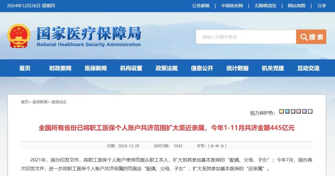 12月26日,国家医保局发布重要通知,全国各省份均已完成职工医保个人账户共济范围的扩大工作,将共济范围扩展至近亲属,截至今年11月,共济金额累计达到445亿元。