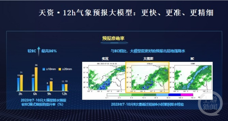 大模型不仅在计算效率上具有明显优势,其预报准确率也远超传统预报。相较于传统区域数值预报模式需用时1小时,大模型仅需10分钟即可完成预报。在降雨预报准确率方面,大模型最高可提升36%。