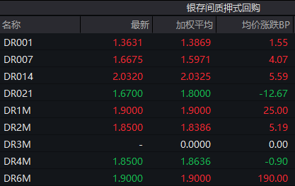 银行间市场回购定盘利率全线上涨,其中R001报1.5200%,较上一交易日上涨2个基点;FR007报2.2400%,较上一交易日上涨19个基点;FR014报2.1800%,较上一交易日上涨13个基点。