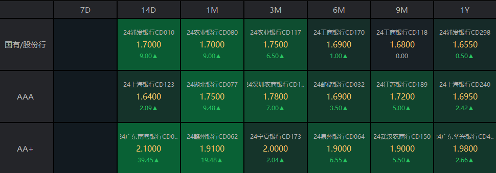 存单方面,今日3个月期国股需求较好,报价区间在1.7%-1.78%,较前一日上行6.5个基点;1年期国股报价区间为1.6%-1.75%,较前一日上行0.5个基点。AAA级存单方面,9个月期成交价为1.72%,1年期成交价为1.695%。