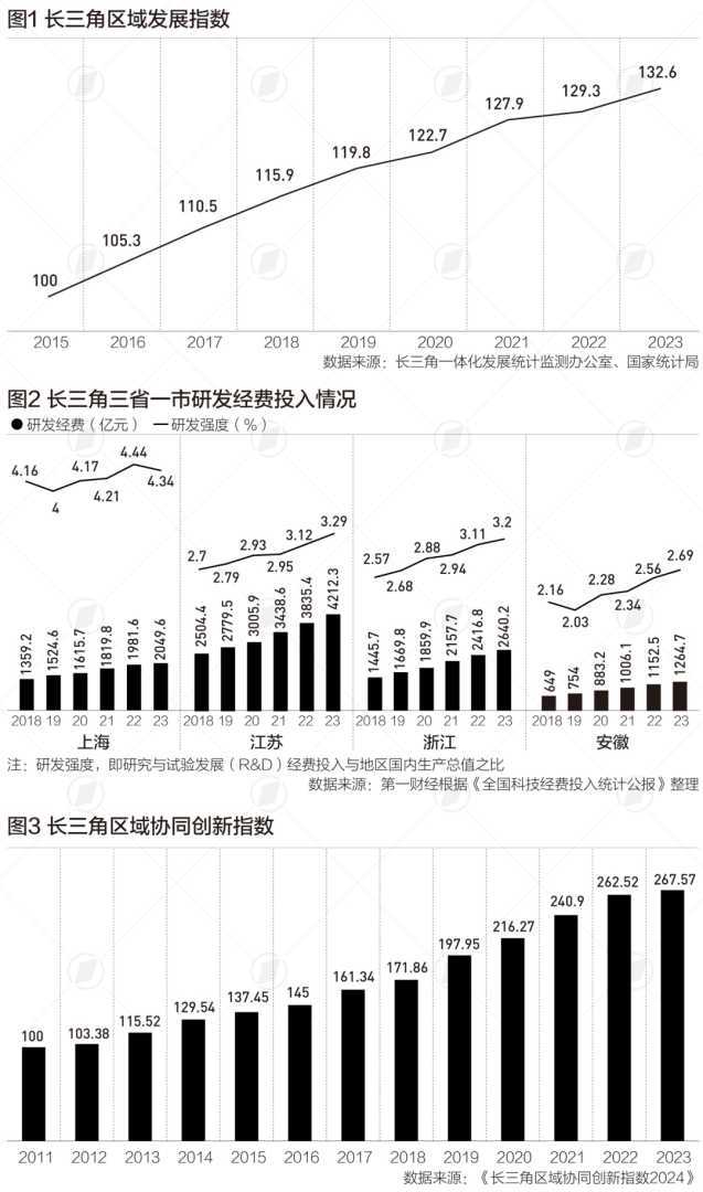 长三角一体化发展统计监测办公室发布的数据显示,自2018年长三角一体化发展上升为国家战略以来,长三角区域发展指数年均提高3.3。2023年,长三角区域创新共建指数为154.3,区域研究与试验发展(R&D)经费投入达10167亿元,是2018年的1.7倍。此外,长三角区域数字经济核心产业发明专利有效量达43万件,占全国总量的26.8%。