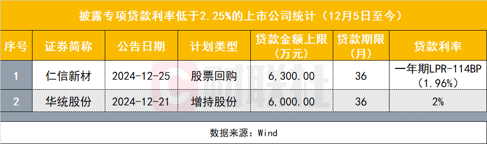 在贷款利率方面,虽然大多数公告未提及具体年利率,但两家民营上市公司披露获得了低于2.25%的年利率专项贷款。例如,仁信新材(301395.SZ)的年利率为1.96%,华统股份(002840.SZ)的年利率为2.0%。此外,随着新细则允许向9月24日前公告回购增持计划的上市公司及重要股东发放专项贷款,已有十余家公司调整资金来源。