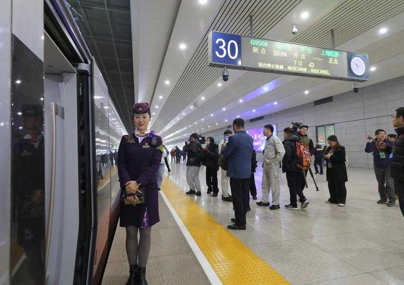 G9508次高铁列车乘务员在上海虹桥站迎接乘客下车图片来源:新华社