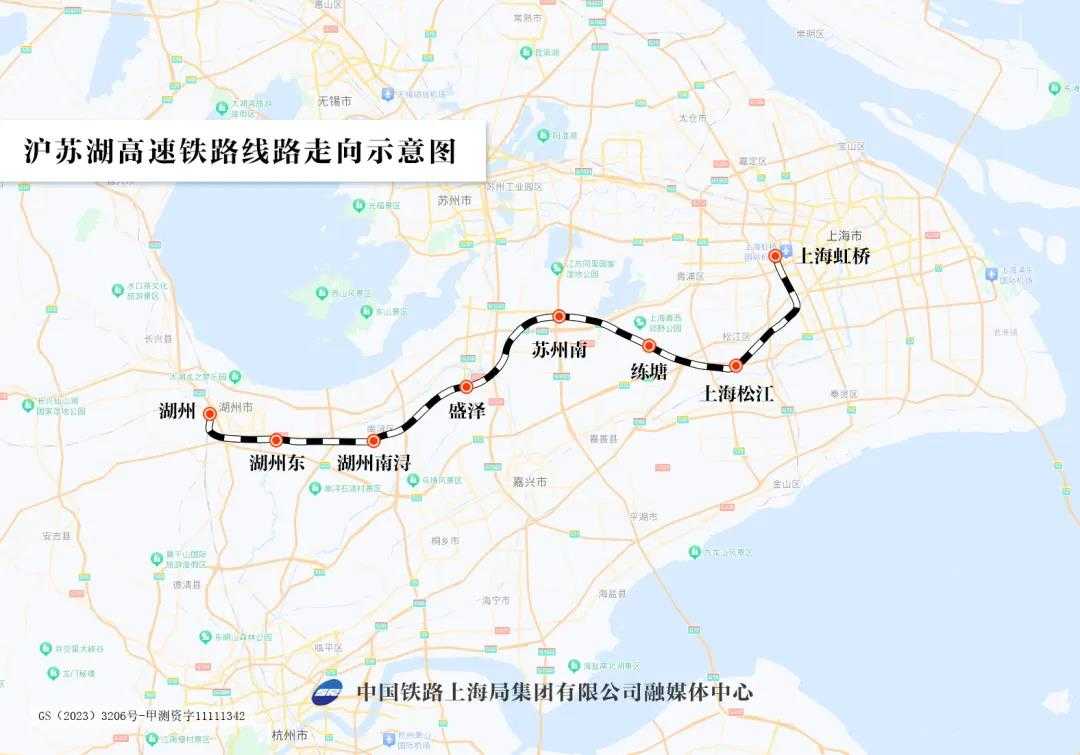 沪苏湖高铁作为长三角城际轨道交通网的骨干线路,东起上海虹桥站,西至湖州市湖州站,途经苏州市吴江区,全线共设8座车站。它进一步优化了上海铁路枢纽布局,完善了区域路网,有效缓解了沪宁、沪杭铁路的运输压力,同时也使浙西北、皖南地区至上海的时空距离大幅缩短。